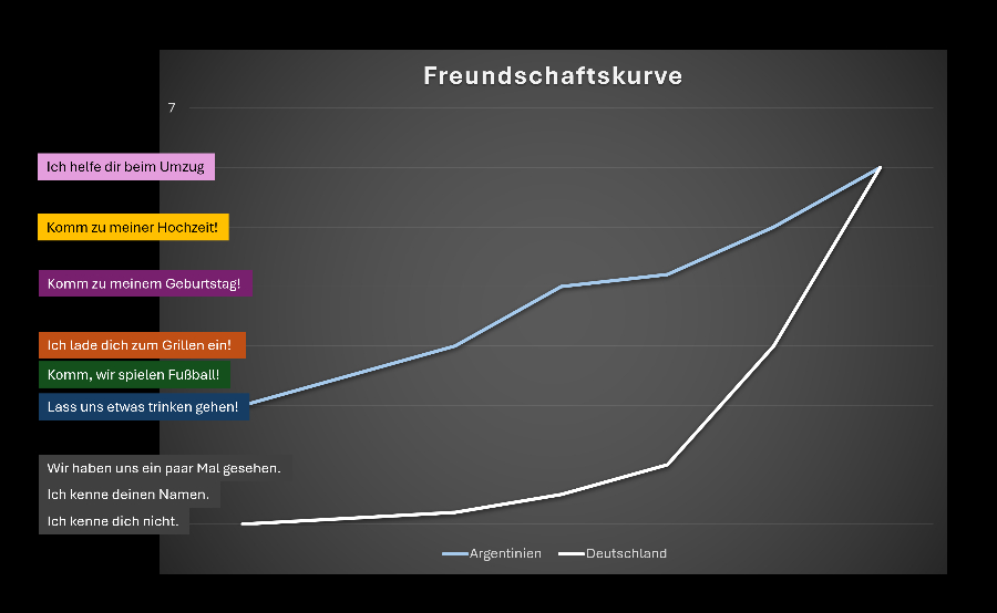 Die Freundschaftskurve Ich habe daraus meine eigene Theorie entwickelt: Die Freundschaftskurve. Auf der Y-Achse das Freundschaftslevel, von “Ich kenn dich nicht” zu “Ich helfe dir beim Umzug”. Auf der X-Achse die investierte Zeit. In Argentinien beginnt sie gleich weiter oben, bei “Komm, wir gehen was trinken”. Und das ist immer eine gute Basis, um eine solide Freundschaft zu bilden – zumindest, wenn man auf “¿Vamos?” mit “¡Sí!” antwortet.