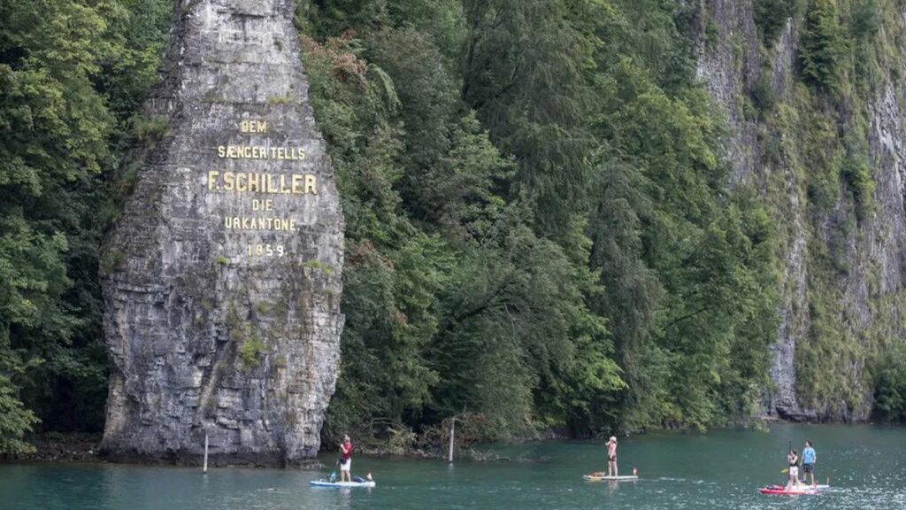 Stand-up paddling junto al monumento a Friedrich Schiller en la orilla del lago de Lucerna, durante las celebraciones del 1° de agosto.(Foto: Keystone / Peter Klaunzer)