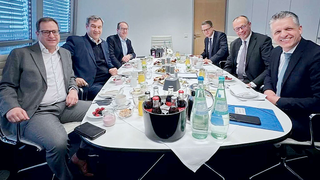 La jornada parlamentaria también estuvo marcada por una intervención simbólica frente al Bundestag. Allí, la iniciativa #ParitätJetzt y la Fundación Federal para la Igualdad (Bundesstiftung Gleichstellung) instalaron un cartel gigante con una foto conocida: la “mesa de hombres” de la CDU/CSU, tomada durante una ronda de negociación y en la que no aparece ninguna mujer.