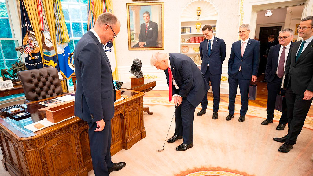 Trump probó el putter en el Salón Oval y respondió con una chaqueta de aviador y una patente histórica, en guiño al perfil de piloto de Merz.