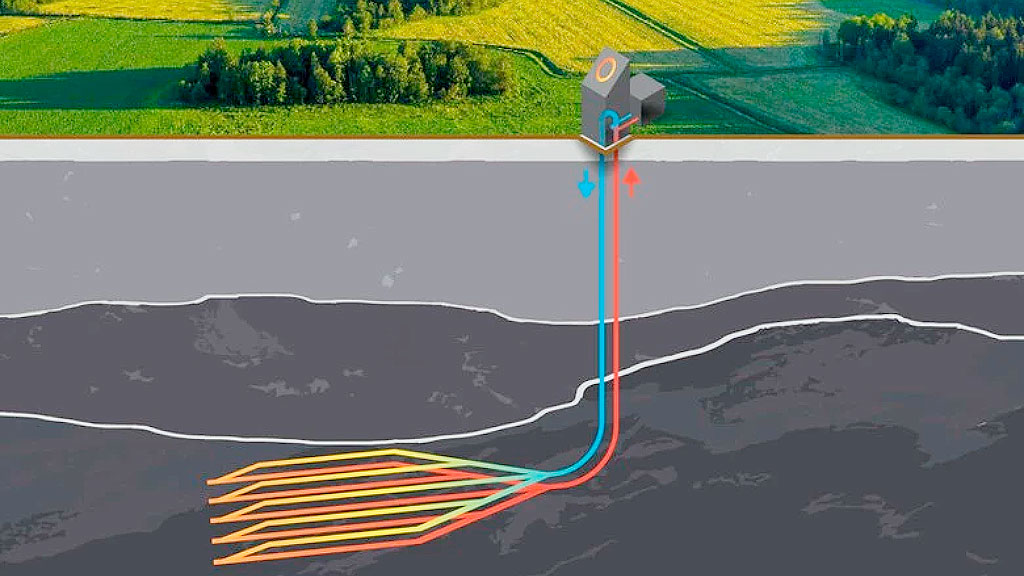El sistema desarrollado por Eavor no necesita acuíferos subterráneos ni fracturación hidráulica. La empresa perfora dos pozos verticales que luego se ramifican en una docena de ramales horizontales. Así se maximiza el contacto con la roca caliente.