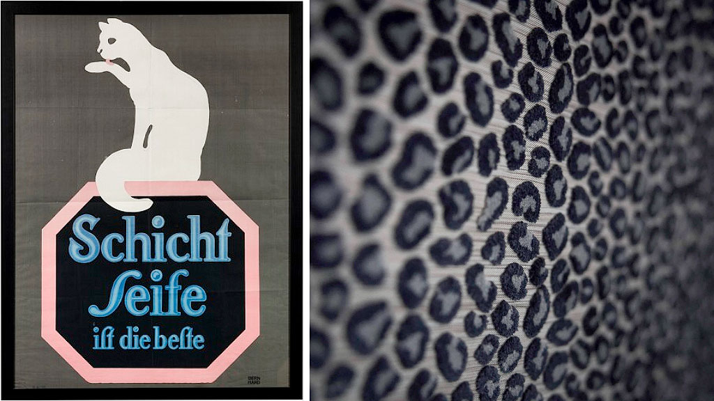 Un cartel alemán de 1910 colgaba como pieza decorativa: “Schicht-Seife ist die beste”. El dormitorio de su infancia fue recreado con papel tapiz de leopardo.
