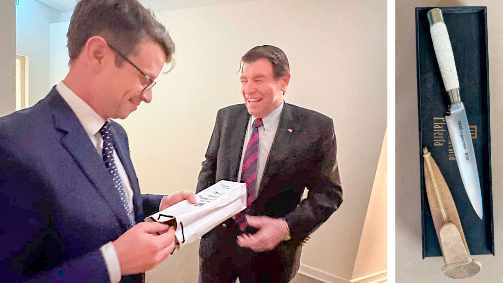 Como muestra de gratitud, la FAAG le obsequió un cuchillo artesanal con mango trenzado en tientos, realizado según técnicas tradicionales de la soguetería criolla argentina. En respeto a una antigua costumbre popular que sugiere evitar el regalo directo de cuchillos, el presente fue entregado mediante una compra simbólica.