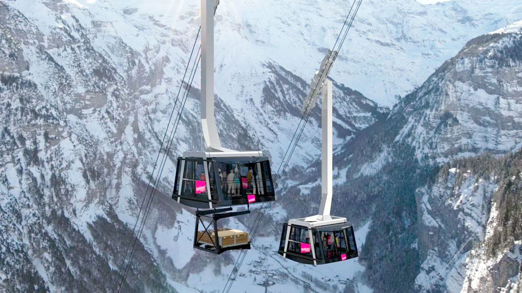 El tramo Stechelberg-Mürren permite ascender 775 metros de desnivel en apenas cuatro minutos, con cabinas que se desplazan a una velocidad de siete metros por segundo. Cada unidad está diseñada para transportar hasta 85 pasajeros y, a plena capacidad, el sistema puede movilizar hasta 800 personas por hora. Todo el trayecto está completamente automatizado: no hay personal a bordo, pero el control se realiza mediante cámaras y sensores en tiempo real. Las cabinas cuelgan de un brazo de 11 metros, una necesidad impuesta por la fuerte inclinación del terreno.